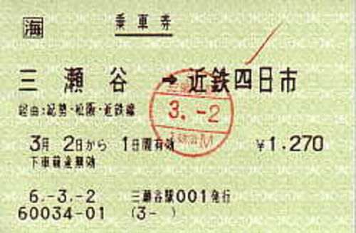 近鉄四日市 松阪接続のJR→近鉄の連絡券です。今はなきJR東海のPOS端末で発券されています。マルス端末に酷似していますが左上の[海]の表記と「三瀬谷駅001発行」というのが特徴です。現在、三瀬谷駅にはマルス端末が導入されています。 先に紹介…