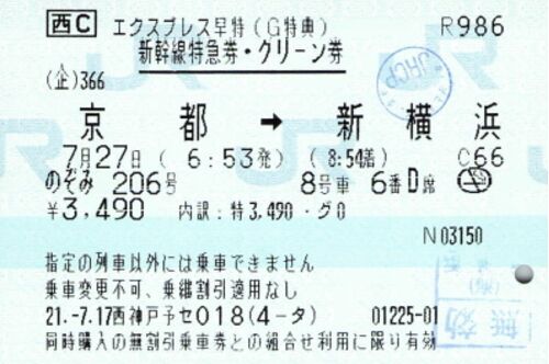 エクスプレス早特+グリーン特典 下のきっぷは首都圏~名古屋・京都・新大阪・新神戸間の「ひかり」全列車と6時台発「のぞみ」に適用された「エクスプレス早特」とエクスプレス予約会員特典のグリーン特典を組み合わせたものです。あまり知られていませんが…