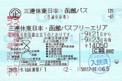三連休東日本・函館パス 「三連休東日本・函館パス」は三連休の3日間JR東日本管内+αを自由に乗り降りできる特急料金を含まない乗車券タイプのフリーきっぷです。+αのJR東日本以外のフリーエリアは以下のとおりです。 【JR東日本以外のフリーエリア】…
