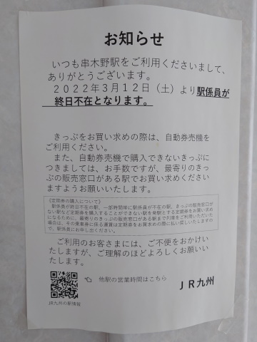 この掲示では串木野駅は3月12日以降に終日無人になると記載されていますが、実際はPOS窓口の営業はダイヤ改正前日の3月11日で終了したものの、3月いっぱいは業務委託の係員がいたようで、4月1日より終日無人化となりました。