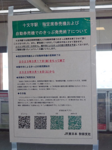 十文字駅は先のダイヤ改正までは業務委託駅でしたが、業務委託を終了し無人化されました。それに伴って指定席券売機と近距離の自動券売機が撤去されました。券売機終了のお知らせには以下のような記載がありました。
