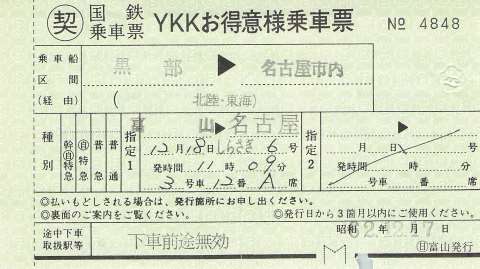 YKKは建材や工機もやっているようですが、なんと言ってもファスナーのトップメーカーとして有名で、同社のHPによると富山県黒部市に中核となる開発・生産の拠点があります。こういった企業の乗車票は自社の社員が使用するという印象がありますが、「お得意様乗車票」という以上、YKKの社員が使うわけではなさそうです。おそらく商談か何かで黒部を訪れた相手に対し交通費代わりにこの乗車票を渡していたんでしょう。